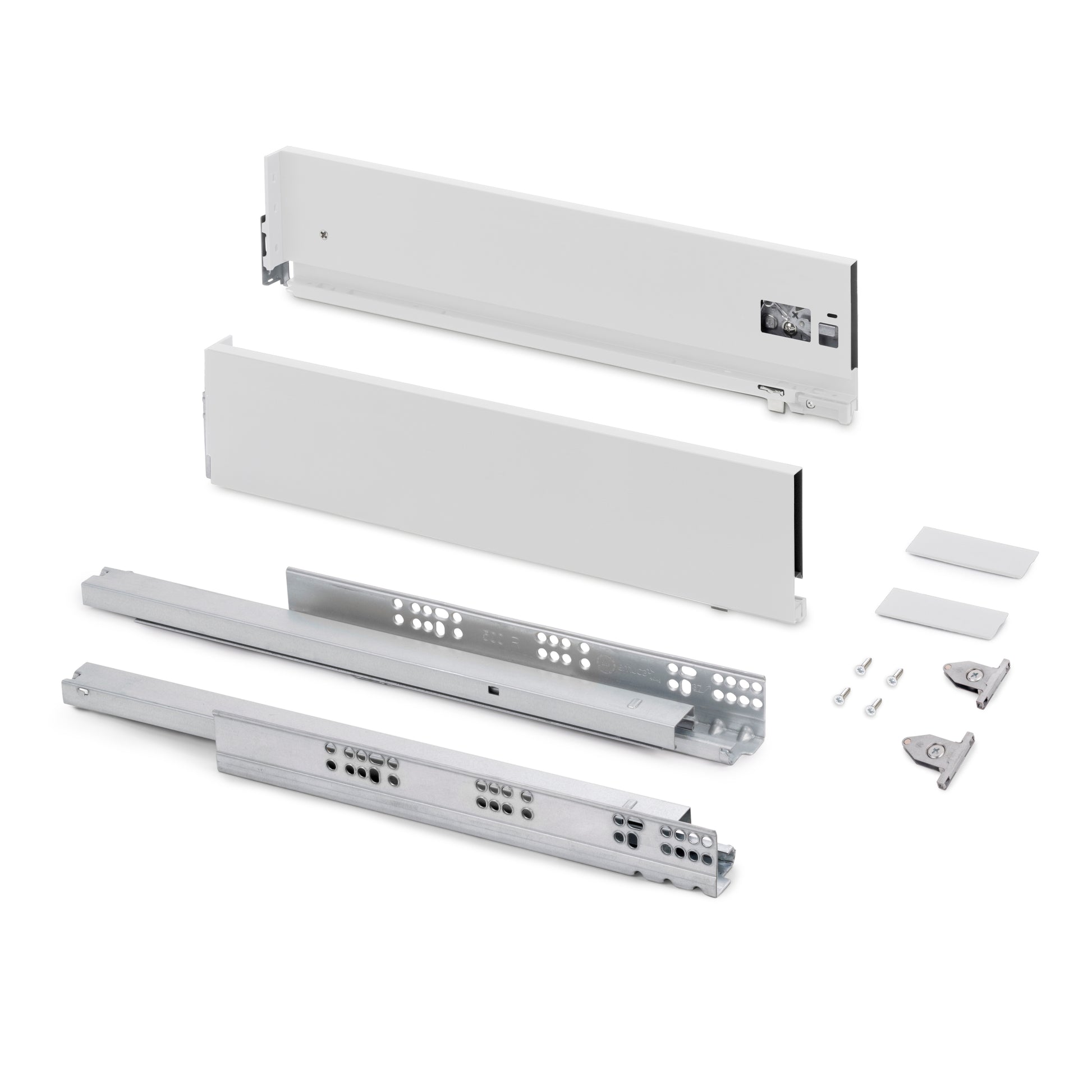 Kit per cassetto cucina e bagno Vertex con tutti gli elementi necessari per il suo assemblaggio. È la soluzione ottimale per i mobili della tua cucina, bagno o armadio con un design elegante. Ogni kit è composto da tutti gli elementi necessari per il montaggio di un cassetto esterno di 131mm di altezza, progettati per uno spessore del pannello di 16mm, sia per il fondo che per il retro del cassetto. Include: due sponde laterale, un set di guide con chiusura soft, un set di coperchi di rivestimento e i fissaggi per la parte anteriore del cassetto.