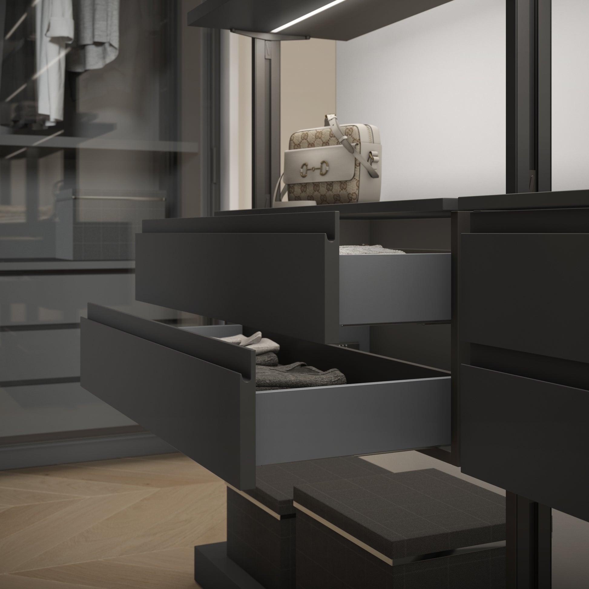 Kit per cassetto cucina e bagno Vertex con tutti gli elementi necessari per il suo assemblaggio. È la soluzione ottimale per i mobili della tua cucina, bagno o armadio con un design elegante in colore grigio antracite. Ogni kit è composto da tutti gli elementi necessari per il montaggio di un cassetto esterno di 93mm di altezza, progettati per uno spessore del pannello di 18mm, sia per il fondo che per il retro del cassetto. Include: due sponde laterale, un set di guide con chiusura soft, un set di coperchi di rivestimento e i fissaggi per la parte anteriore del cassetto.