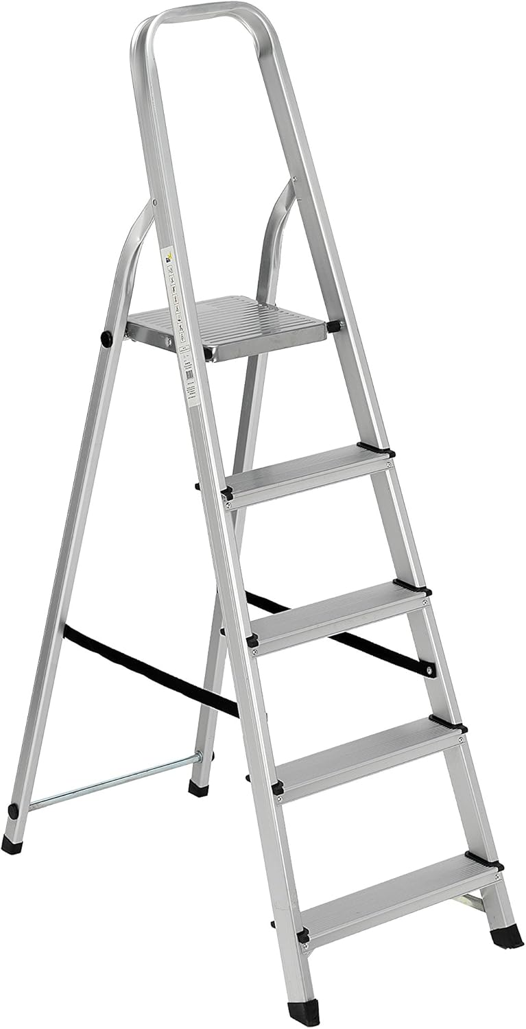 Scala alluminio Everest 5 gradini cm 91x45x150h portata max 150 Kg per uso domestico e bricolage gradini antisdrucciolo, puntali antiscivolo, fettuccia antidivaricamento e gancio di sicurezza.