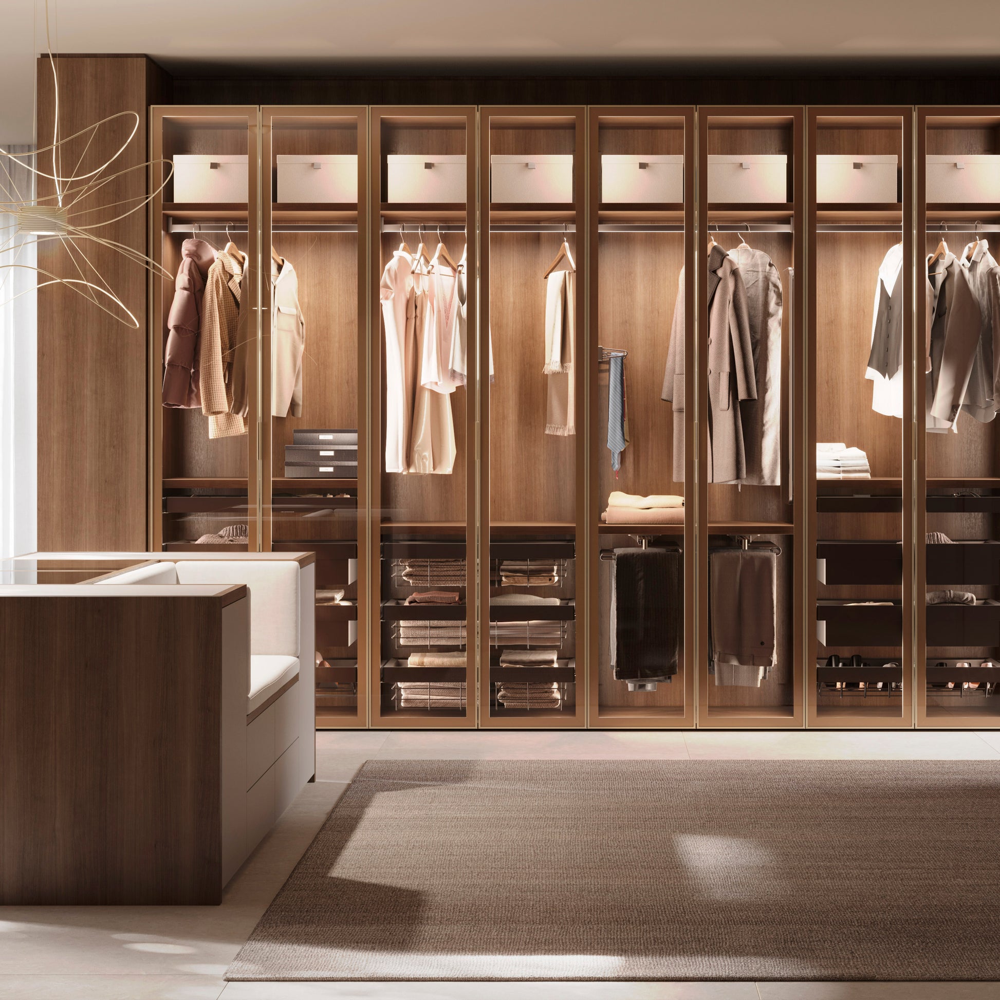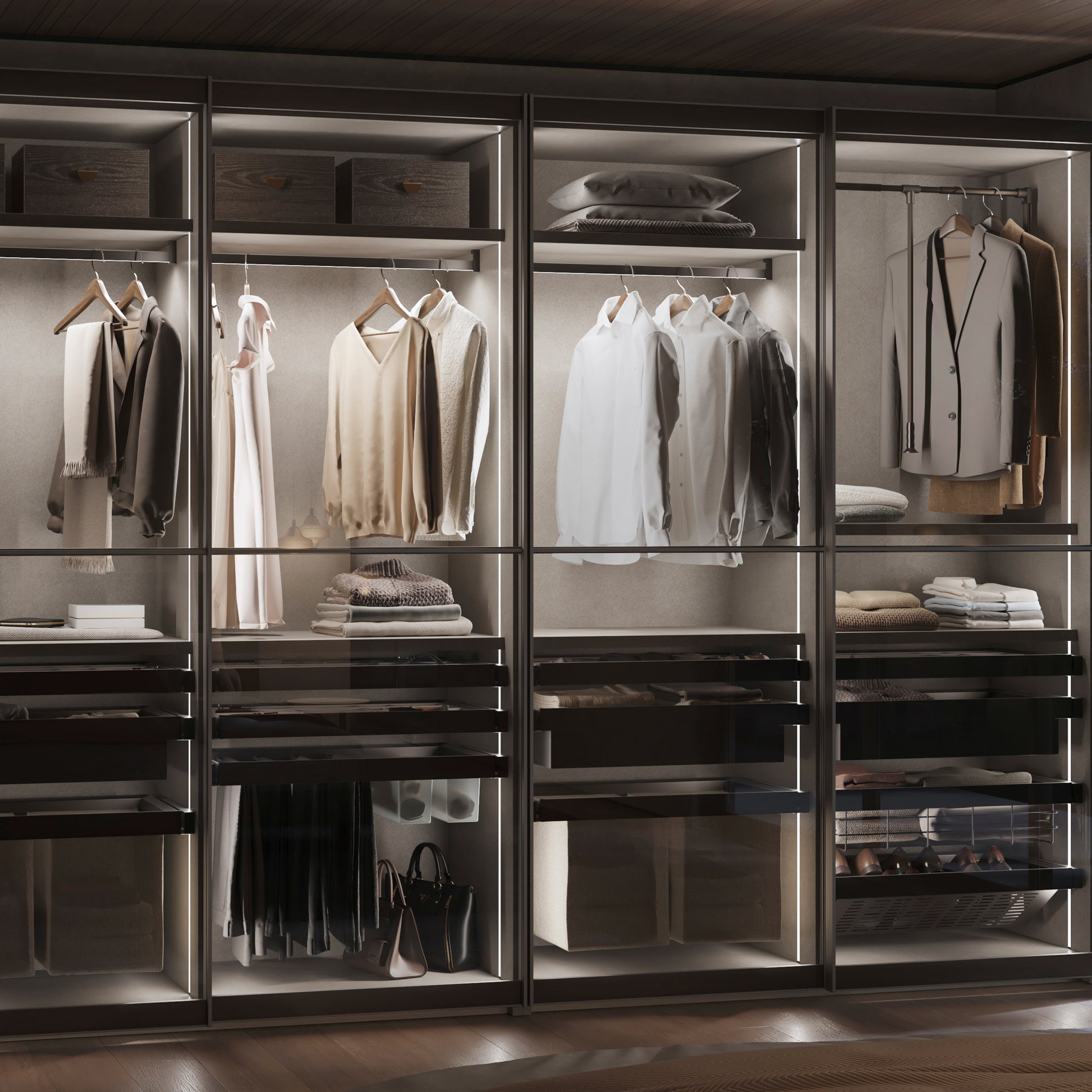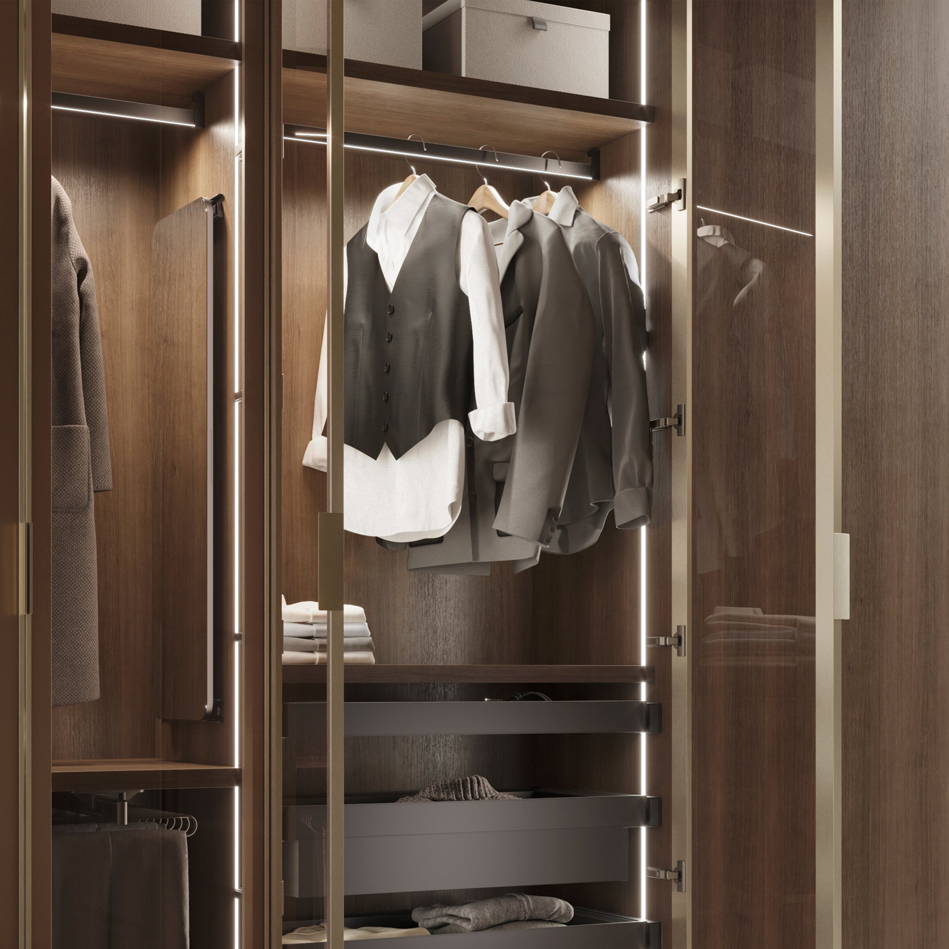 Con una potenza di 7,6 W/m, offre un flusso luminoso di 375 lm/m e una temperatura di colore bianco caldo di 2700 K, perfetta per creare un’atmosfera accogliente all’interno dell’armadio.