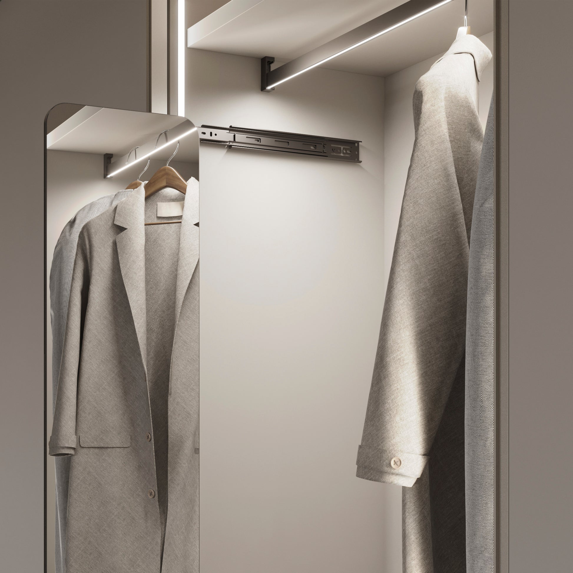 Il kit barra appendiabiti Luxe con luce LED Neonlynx di Emuca è la soluzione ideale per illuminare e organizzare il tuo armadio in modo elegante ed efficiente. Il kit completo include tutto il necessario per un’installazione rapida e ordinata: barra con LED integrato e diffusore, supporti laterali Luxe, alimentatore LED 24 V DC, ricevitore e trasmettitore RF Smart con sensore di movimento e cavo da 1,5 m.