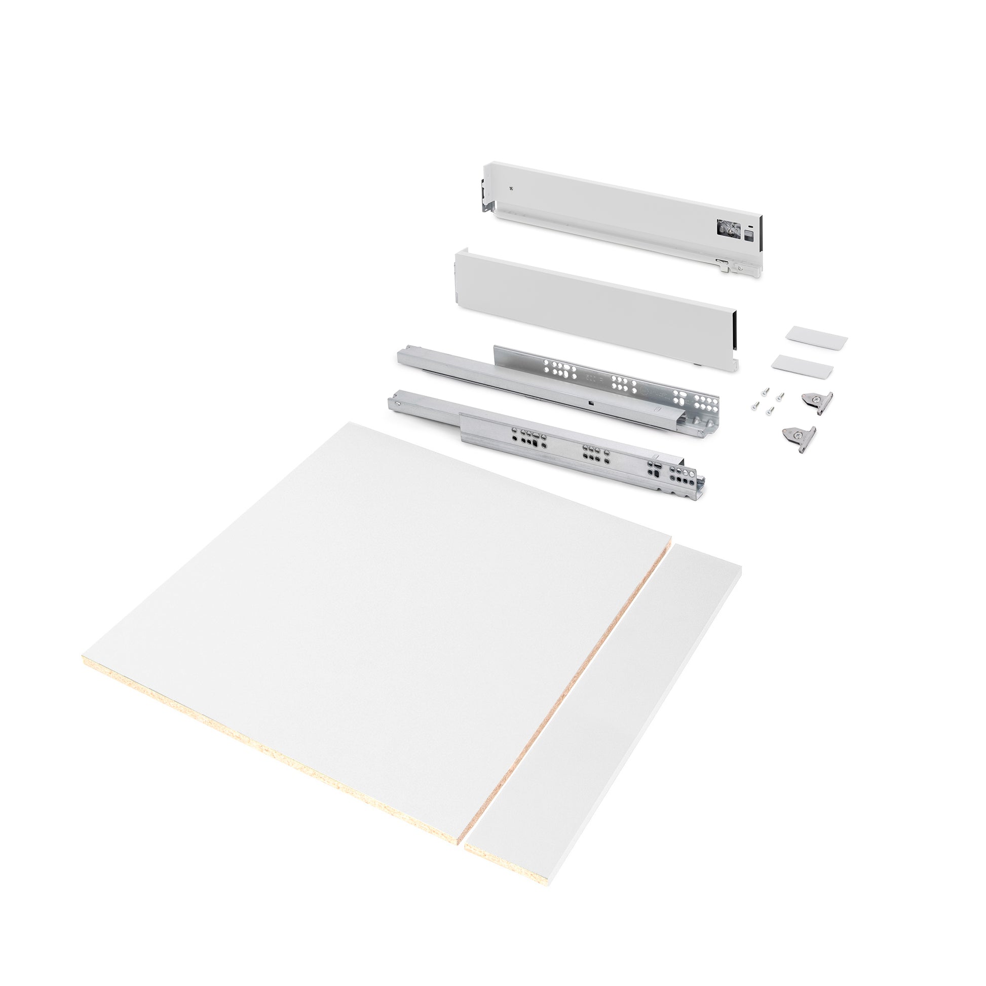 Kit per cassetto cucina e bagno con tutti gli elementi necessari per il suo assemblaggio. È la soluzione ottimale per i mobili della tua cucina, bagno o armadio con un design elegante in colore grigio antracite e bianco. Ogni kit è composto da tutti gli elementi necessari per il montaggio di un cassetto esterno di 93mm di altezza e profondità 500 mm con varie larghezze del modulo. Include: due sponde laterale, un set di guide con chiusura soft, un set di coperchi di rivestimento, pannelli inferiore e posteriore e i fissaggi per la parte anteriore del cassetto. Avrai semplicemente bisogno del pannello frontale con le dimensioni necessarie del cassetto.