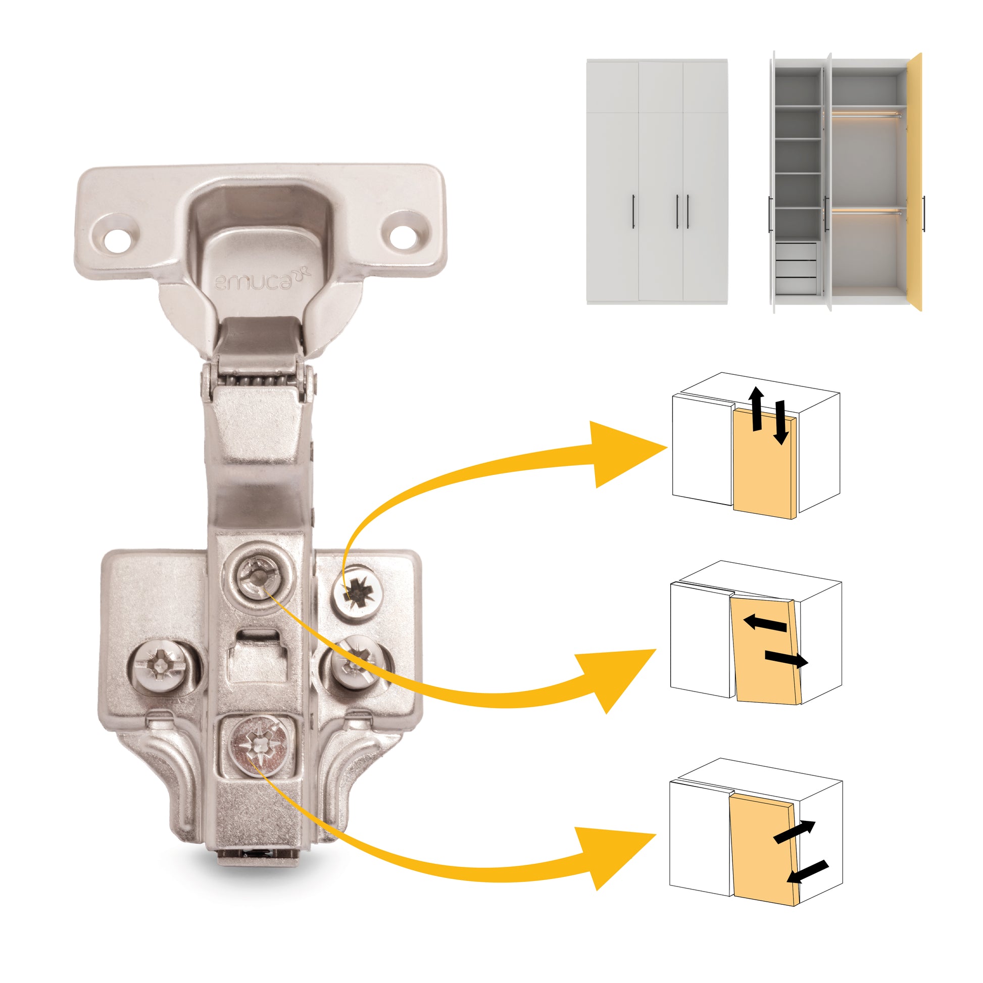 Cerniere per ante progettate per l'utilizzo nei mobili della casa e dell'ufficio con alta qualità e al miglior prezzo. Con pistone ammortizzatore che regola la chiusura soft dell'anta. Sono disponibili in collo dritto con apertura dell'anta a 105º. Per la sua istallazione è necessario un foro diametro 35 mm per lo scodellino. E il fissaggio al pannello avviene mediante le viti incluse. Allo stesso tempo è molto facile l'istallazione grazie al sistema automatico di montaggio a clip della cerniera alla basetta. Inoltre entrambi dispongono di vite eccentrica per una regolazione rapida e comoda. Il fissaggio della basetta avviene con vite Euro che necessita di un foro diamentro 5 x 12 mm nella spalla del mobile.