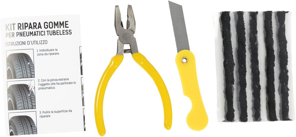 Il kit ripara gomme della linea start è adatto a tutti gli pnematici tubeless, per auto, moto e scooter.Attrezzo alesatore per allargare il foro.Attrezzo con punta a gancio per inserimento striscia di gomma.Con 5 strisce di riparazione.Tubetto mastice da 7 ml.Pinza e ametta.Custodia in tessuto.Facile e pratico da utilizzare.La confezione contiene 7 pezzi.