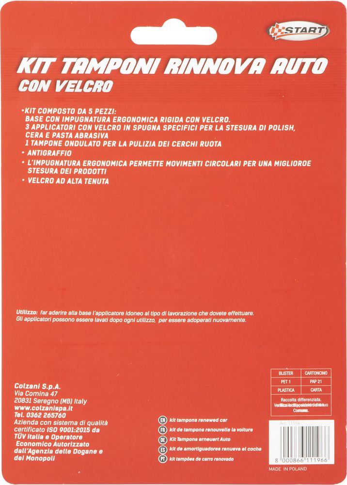 Il kit tamponi rinnova auto con velcro di start è composto da 5 pezzi, un'impugnatura e 4 spugne con azione differente. Nel kit sono presenti un'impugnatura con velcro,un pad arancio per la cera, un pad giallo per polish, un pad azzurro per la pasta abrasiva e un pad nero per i cerchi delle ruote. I pad sono antigraffio, l'impugnatura è ergonomica e permette di effettuare movimenti circolari per una migliore stesura del prodotto.Velcro ad alta tenuta.