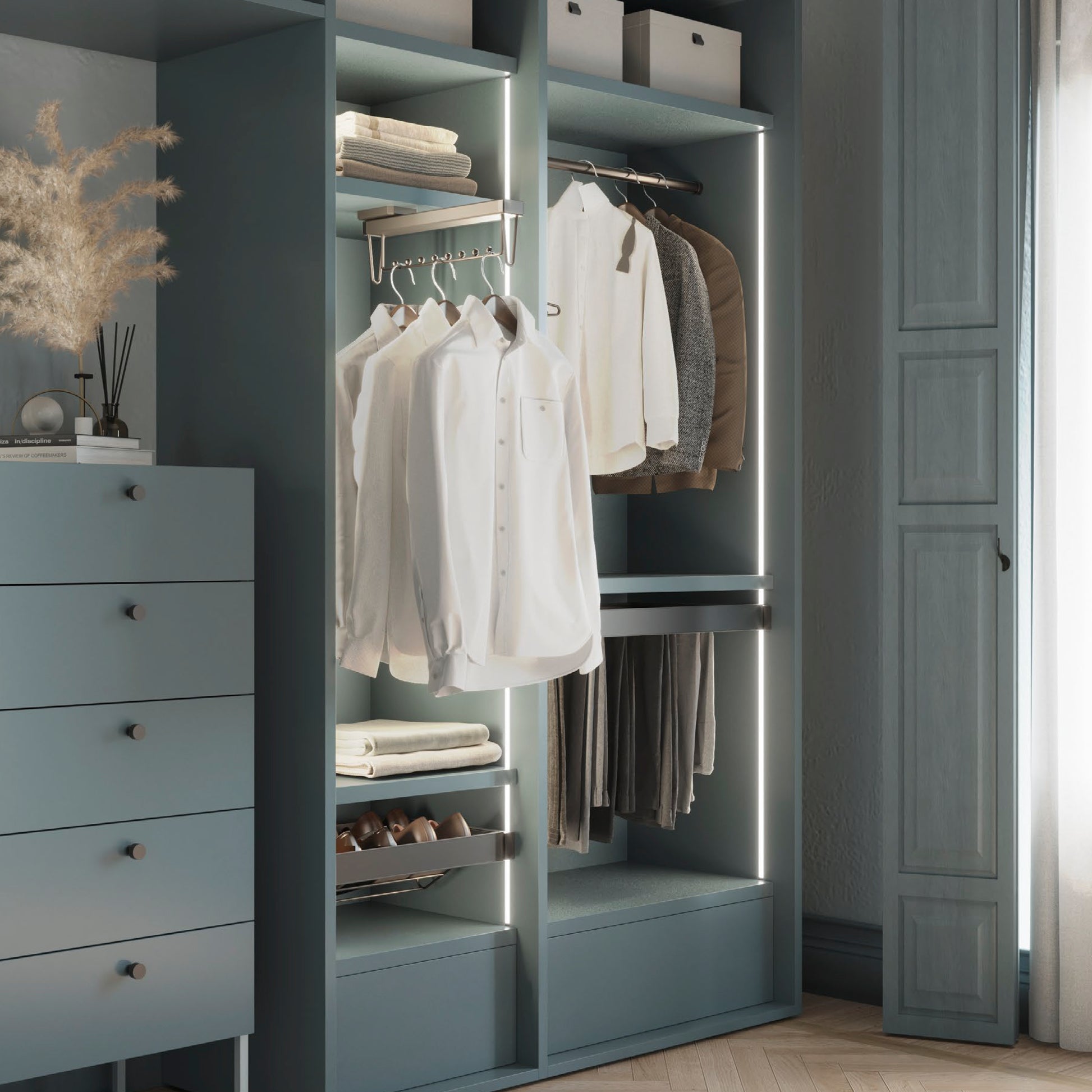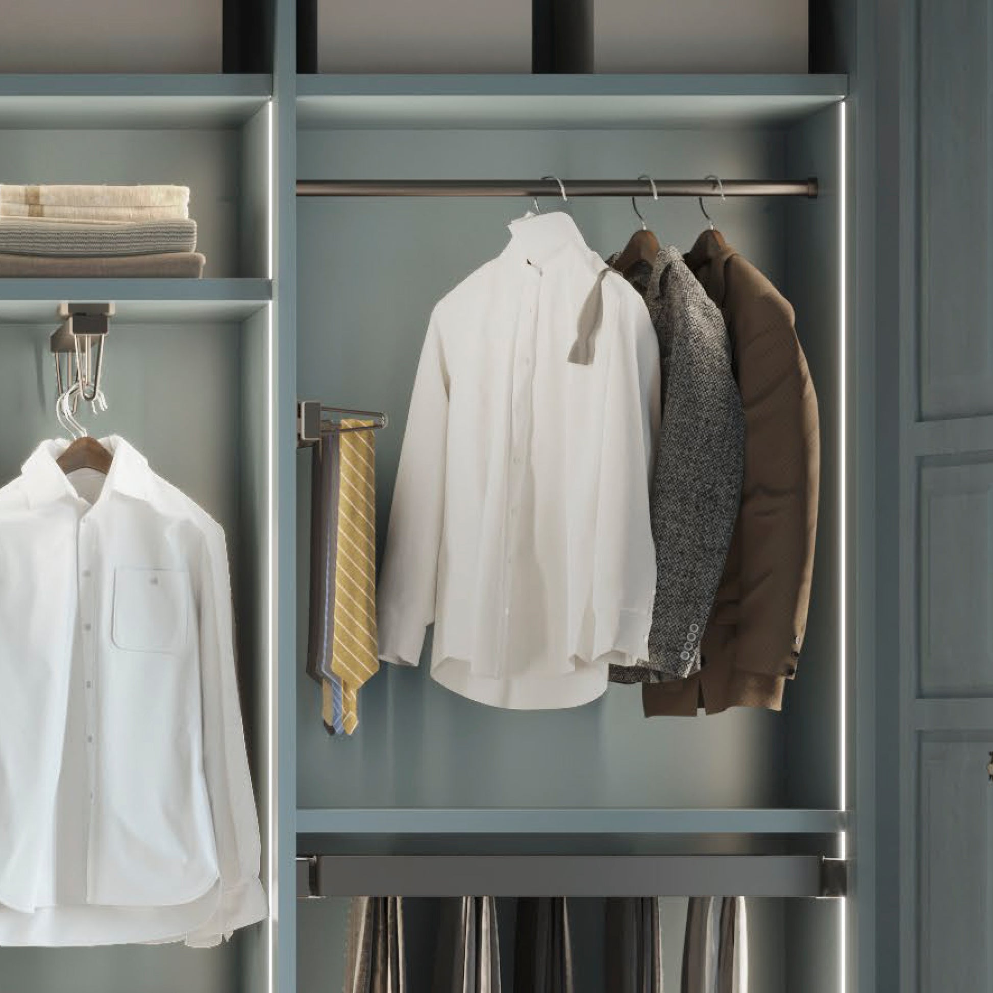 Il tubo appendiabiti è disponibile in due misure: 750mm e 1150 mm. Nei kit di 1150 mm si includono inoltre 2 reggitubi centrali per fornire maggiore rigidità al tutto. Il fissaggio dei reggitubi si realizza mediate le viti M5x38 mm incluse, che sono ideali per pannelli da 16 a 30 mm. In conformità alla norma ISO: 7170:205, la barra ed i reggitubi possono sostenere un peso massimo di 40 kg/metro uniformemente divisi.