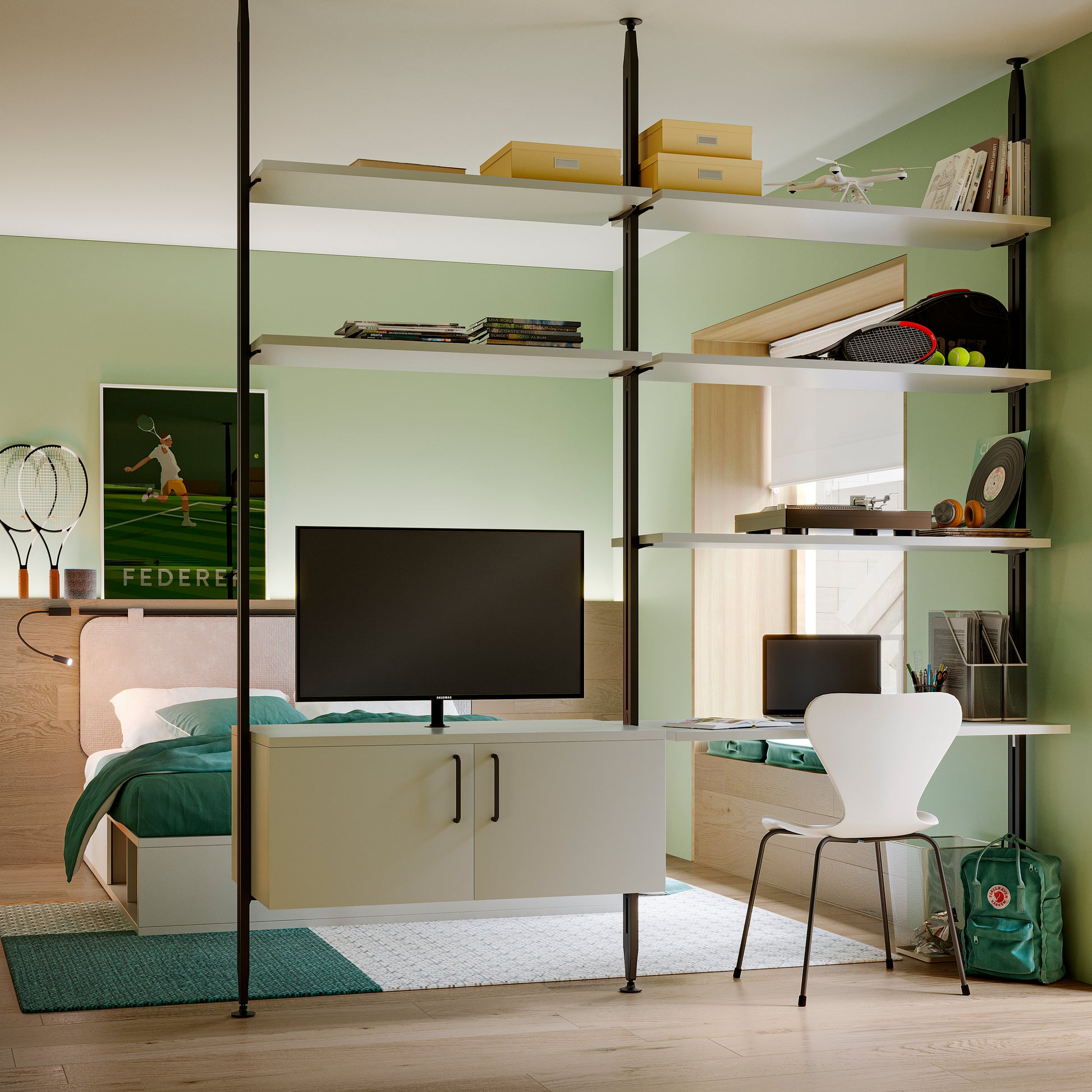 Kit di supporti per la struttura modulare Zero, composto da 3 set di supporti per ripiani in legno e 1 set di supporti per modulo. Include tutti gli accessori per montarlo sul profilo