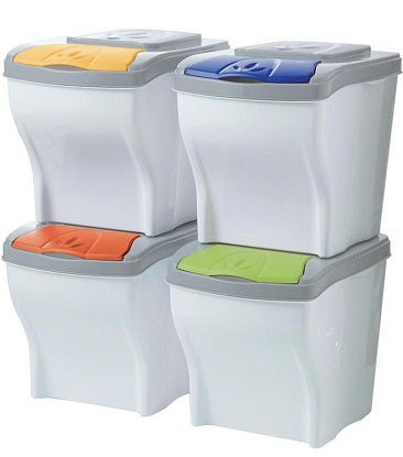 Kit composto da 4 pattumiere per la raccolta differenziata - In polipropilene - Componibile e modulare - Permette l’utilizzo di svariate forme di sacchetti - Non assorbe odori - Non trattiene umidità - Dimensioni cad.: lt.20 cm.28x40x31h